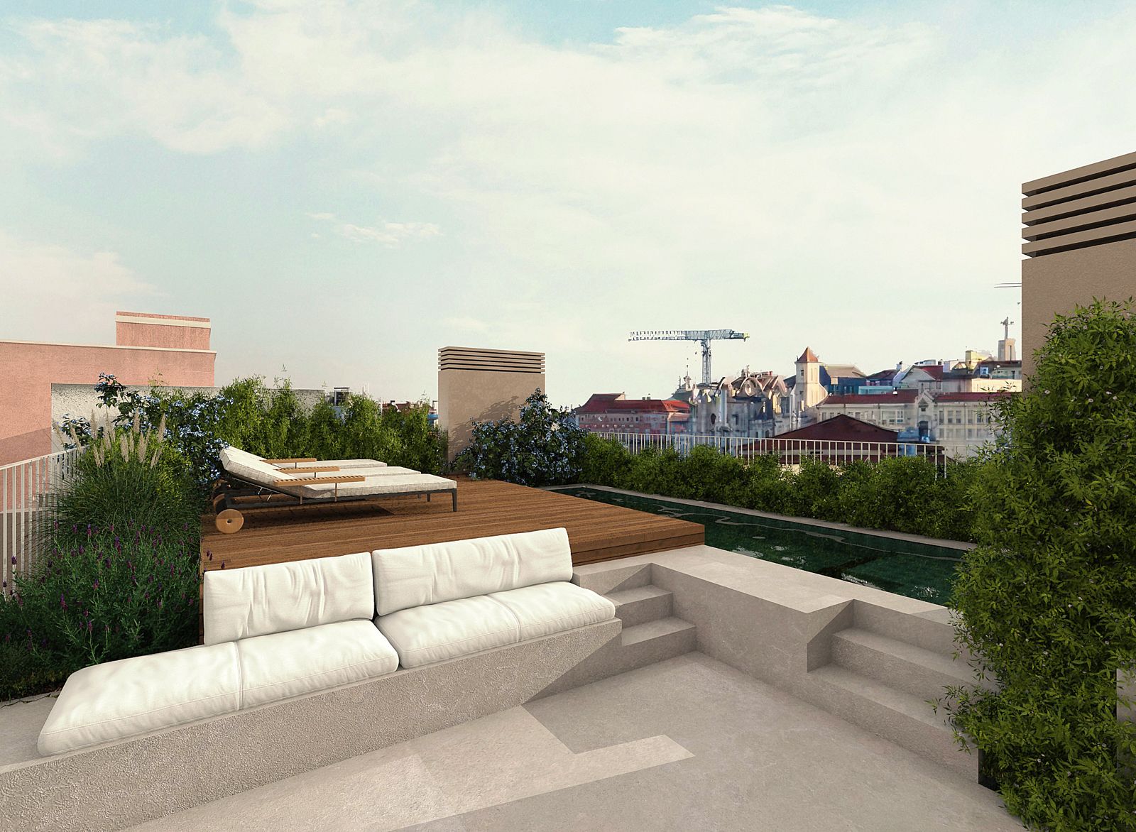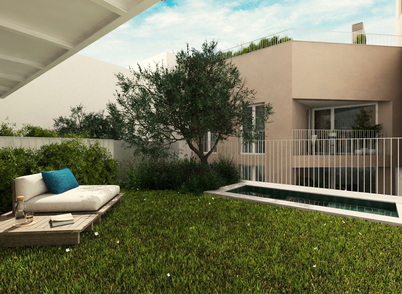 O edifício de apartamentos inclui cinco frações espaçosas T2 e T3, todas com layouts modernos, acabamentos de elevada qualidade e estacionamento privativo. O seu elemento distintivo é o terraço na cobertura com piscina e solário, que oferece vistas amplas sobre Lisboa — uma comodidade exclusiva evidenciada nas imagens e plantas da cobertura.